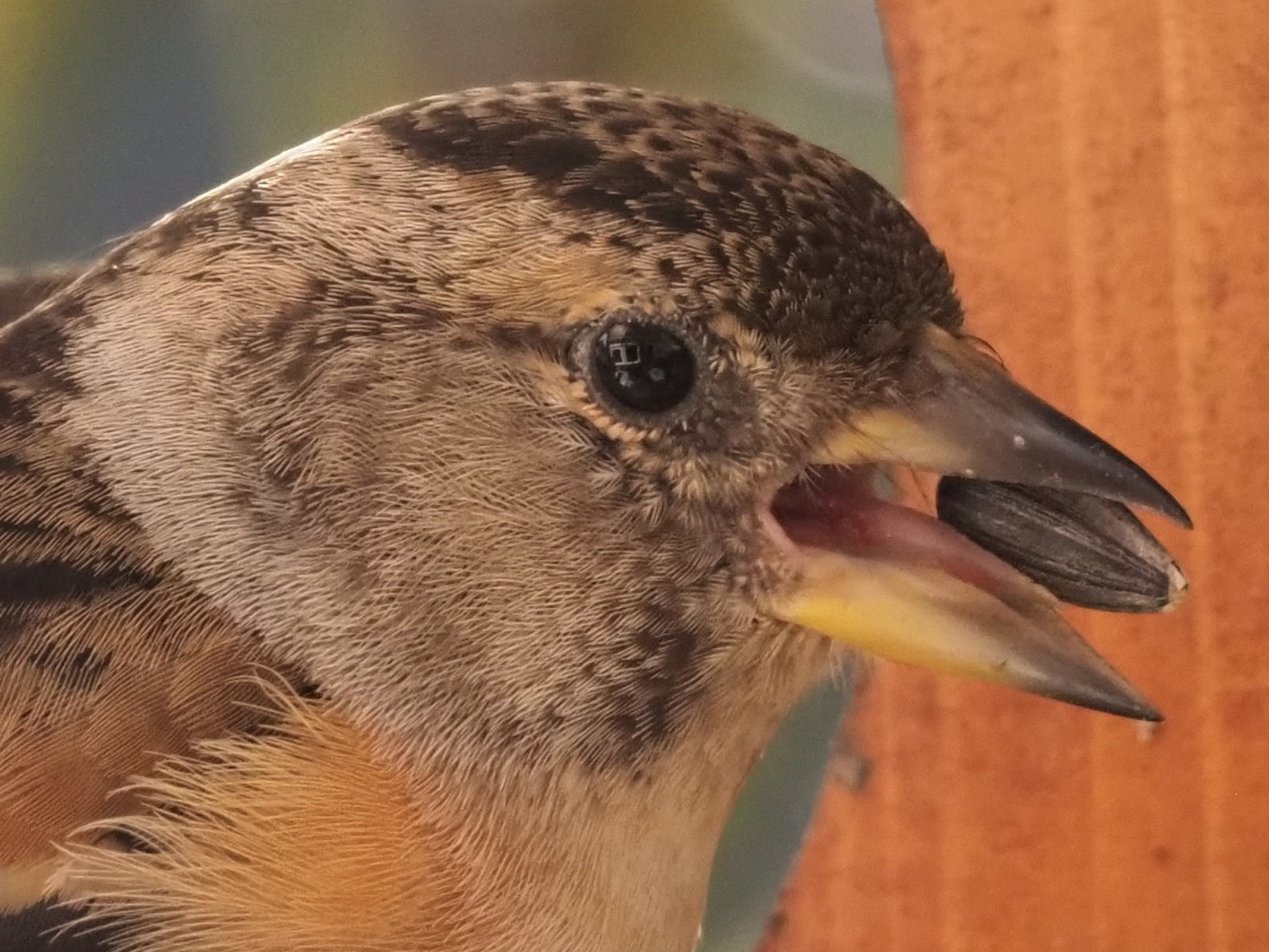 Bergfinkauge spiegelt Fenster