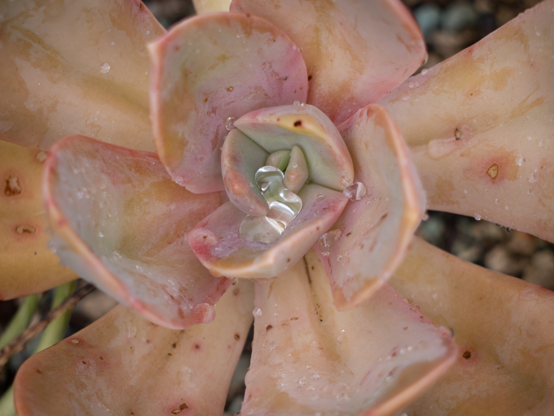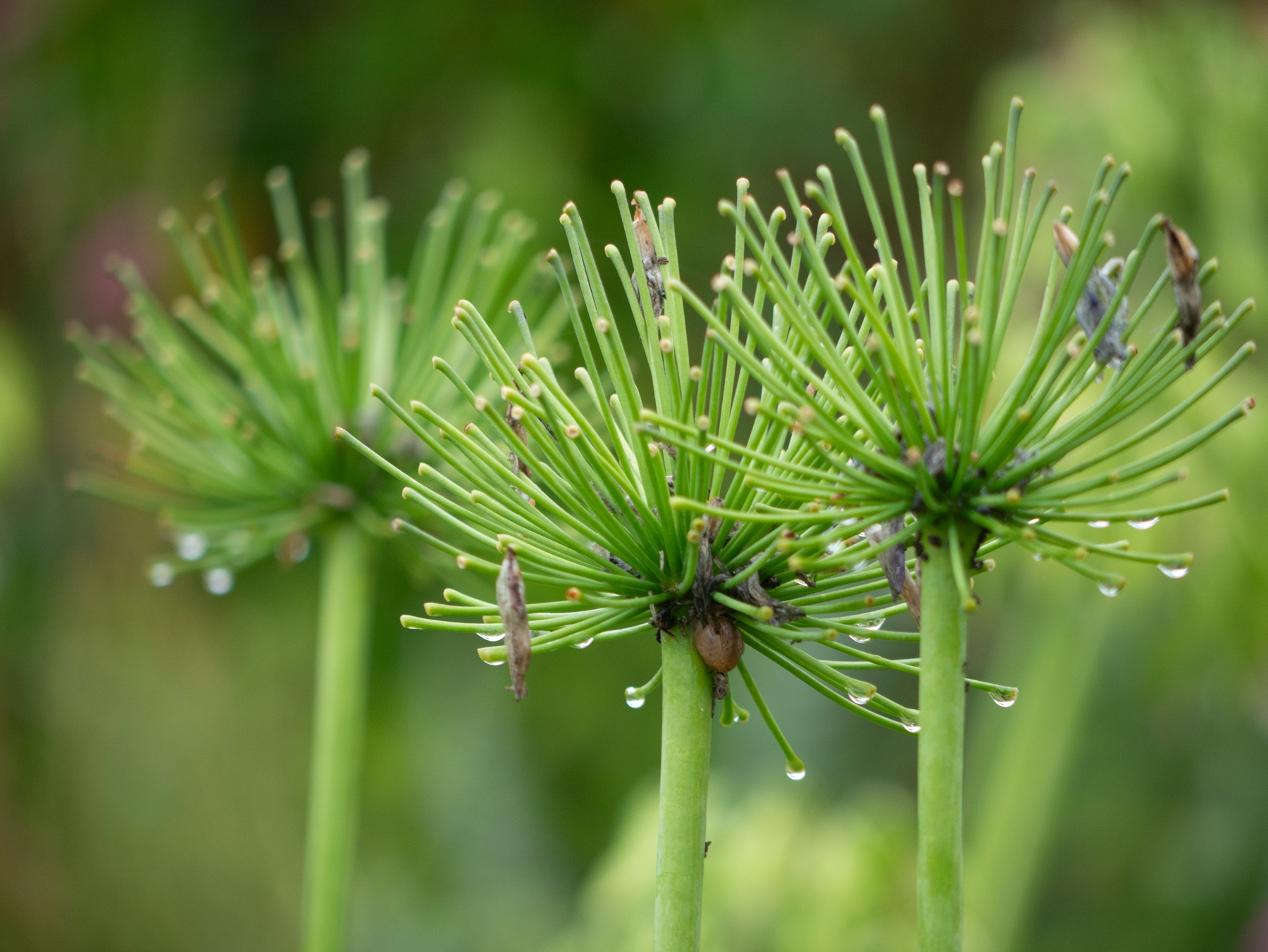 Dreierlei mit Pflanze, Regentropfen und Verwelktem
