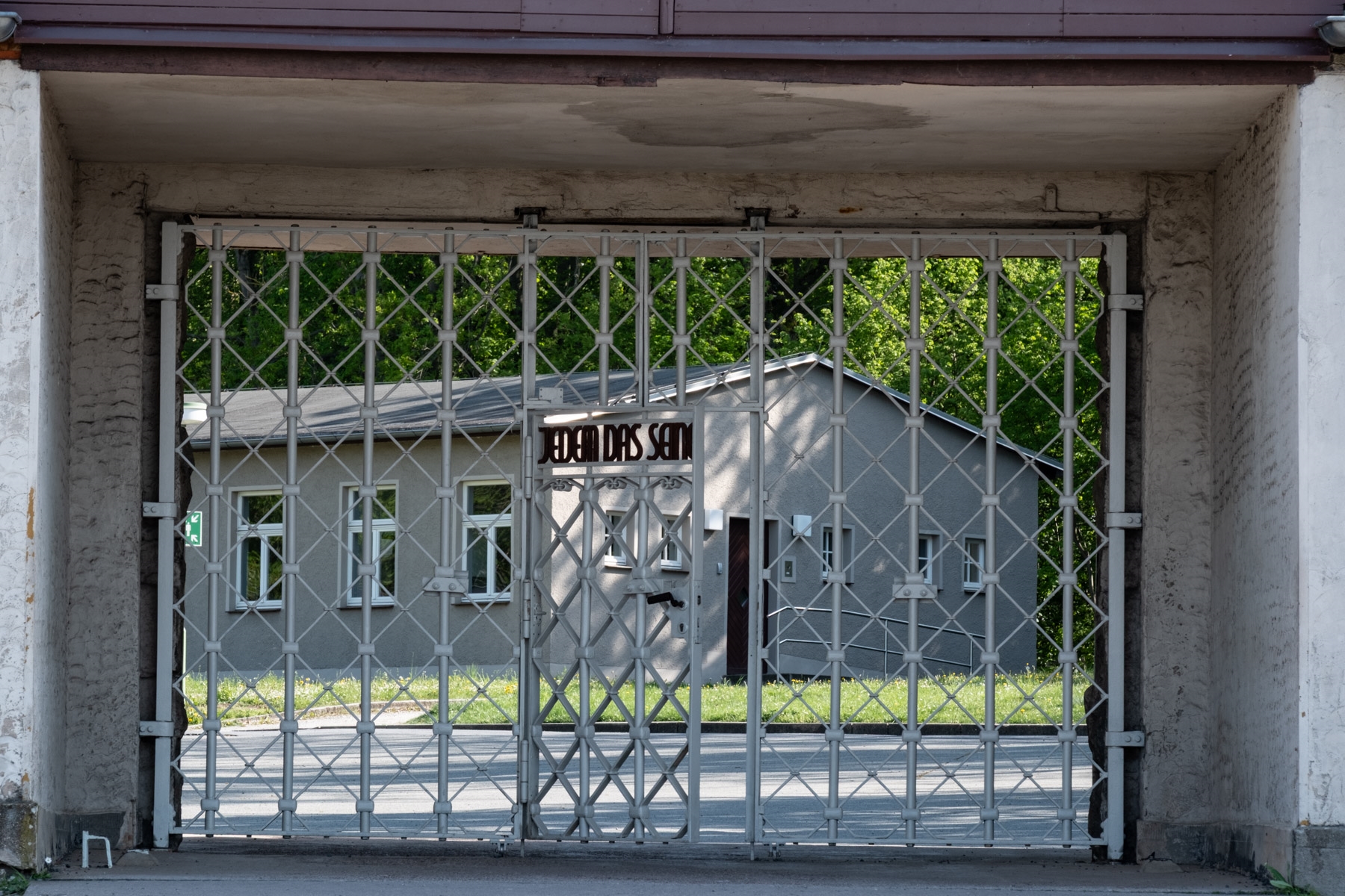 Blick durch das Lagertor auf einen Teil des Kommandanturgebäudes